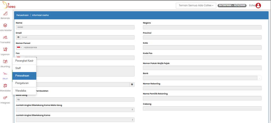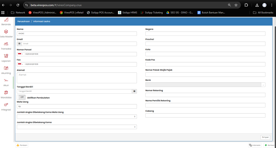 - Nama                   : usaha/perusahaan yang akan tampil di sistem, invoice, laporan, dll.