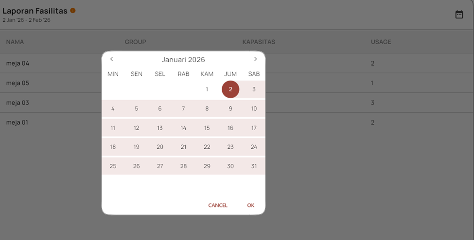 Laporan Fasilitas adalah fitur yang menampilkan daftar lengkap meja di restoran/café beserta status penggunaannya secara real-time. Laporan ini menunjukkan nama meja (misal: Meja 01, Meja 02), kapasitas maksimal (berapa orang yang bisa duduk), dan jumlah tamu yang sedang menggunakan meja tersebut. Dengan laporan ini, staf dapat langsung melihat meja mana yang masih kosong, sedang dipakai, atau bahkan kelebihan kapasitas (misal: meja untuk 2 orang dipakai 3 orang). Fungsinya sangat praktis: mempercepat penempatan tamu baru tanpa perlu keliling ruangan, mencegah kelebihan muatan yang membuat tamu tidak nyaman, serta membantu mengatur antrian secara efisien. Intinya, laporan ini menjadi “peta hidup” operasional harian yang memastikan setiap meja dimanfaatkan secara optimal dan tamu dilayani dengan cepat.