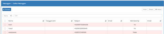 - Hapus: Digunakan untuk menghapus data pelanggan yang dipilih dengan mencentang kotak di sebelah nama pelanggan.