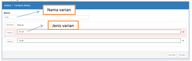 - Kemudian klik tambah beberapa varian yang akan pilih, dan isi sesuai jenis varian apa yg akan dipakai dalam atribut nanti saat pembuatan produk varian, seperti gambar dibawah ini :