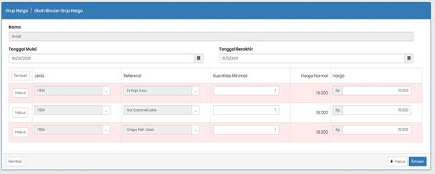 Halaman ini digunakan untuk mengatur harga khusus (seperti harga grosir atau promo) untuk item tertentu dalam periode waktu yang telah ditentukan.