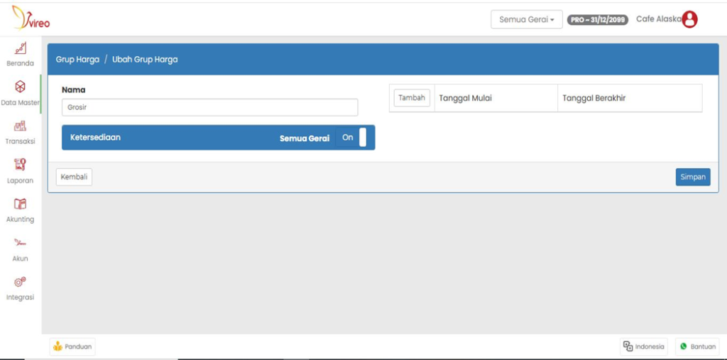 Tambah : Untuk mensetting tanggal group harga nya kapan dimulai dan kapan berakhir dan setting harga untuk pelanggan grosir